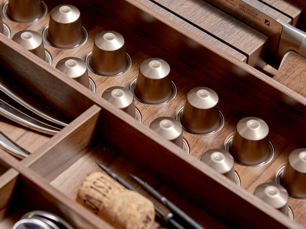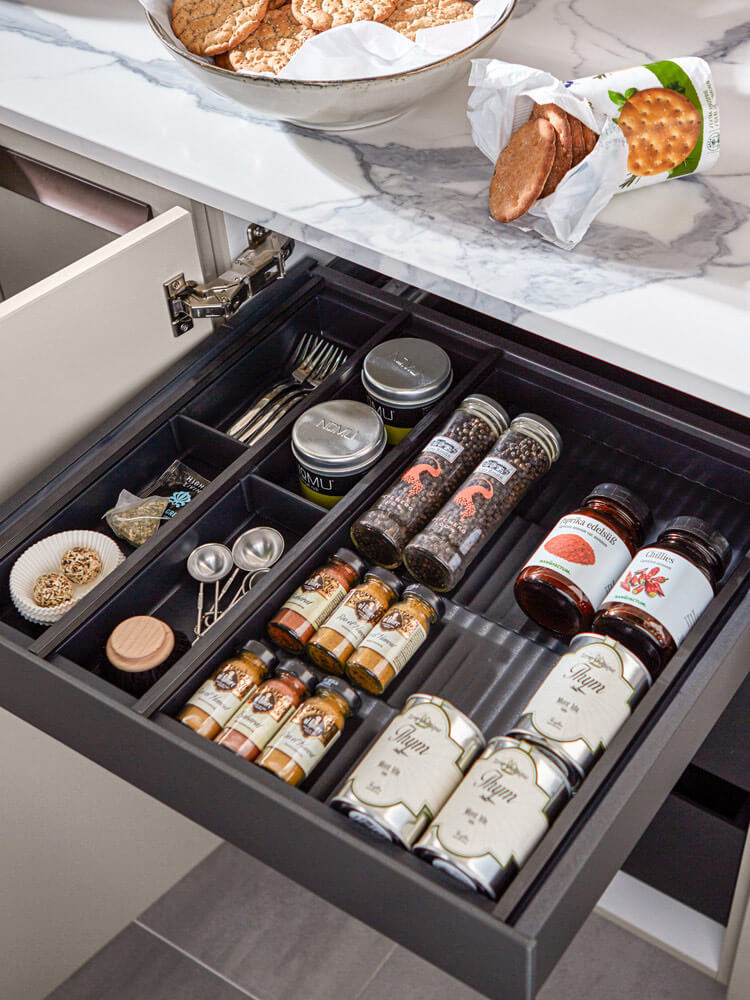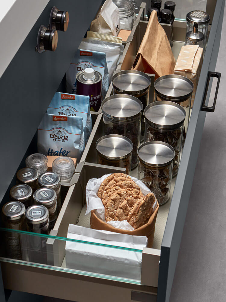 Manchmal braucht man mehr als nur Besteckfächer. Modulare Besteckeinsätze bestehen aus einzelnen Elementen, die Ihr nach Belieben kombinieren könnt. Ob für kleine Schälchen, Gewürze oder Küchenhelfer – Ihr gestaltet Eure Schublade ganz nach Euren Bedürfnissen. Dies ermöglicht es Euch, Zonen für verschiedene Kategorien von Gegenständen zu schaffen, wie z.B. eine Backzone oder eine Frühstücksstation – schaut Euch die traumhafte Küche an und lasst Euch inspirieren.