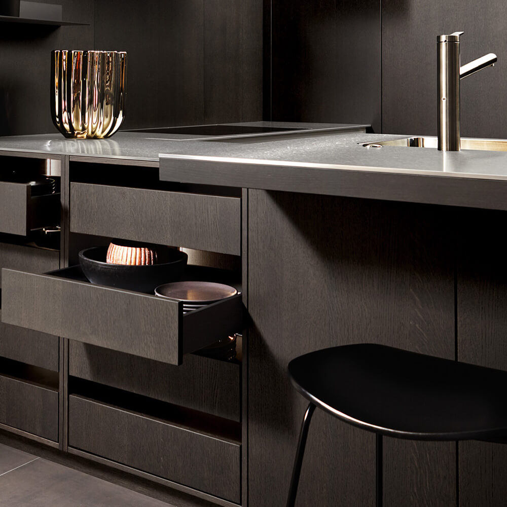 Wenn wir über dunkle Hölzer sprechen, meinen wir heute eine neue Form der Eleganz. Besonders zwei Richtungen prägen das Bild der modernen Holzküchen bei ASMO. Die hochwertige Luxusküche von LEICHT mit den Fronten in dunkler Bergamo Ulme bildet einen kraftvollen Kontrast zu den hellen Wandelementen.