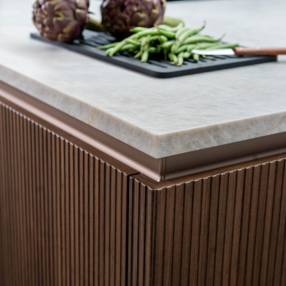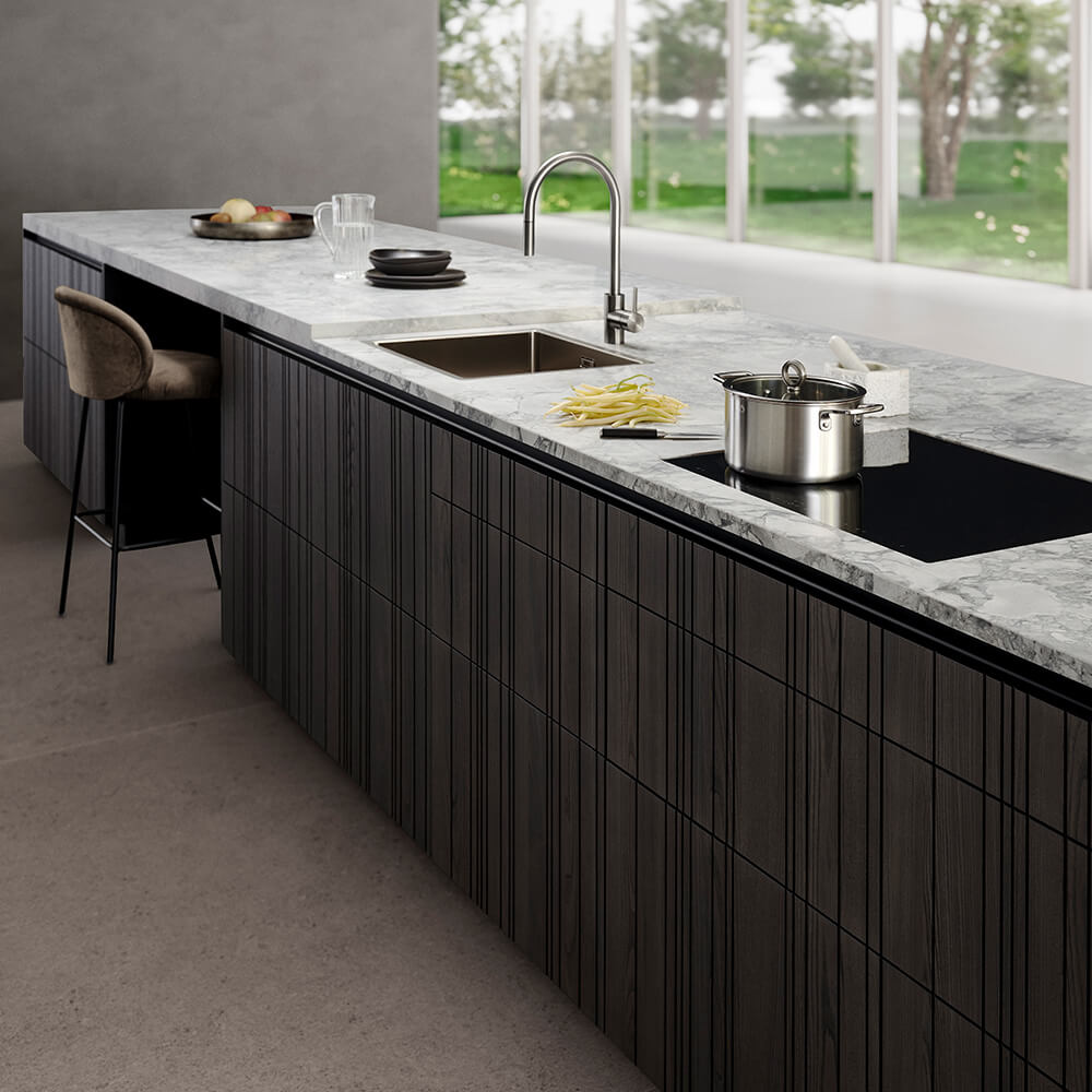 Eine dunkle Frontkombination benötigt Kontraste. Wir empfehlen helle Arbeitsplatten aus Naturstein oder Keramik. Auch ein heller Backsplash oder ein sanfter Wandton in Beige oder Greige öffnet den Raum optisch. So bleibt die Küche freundlich und einladend.