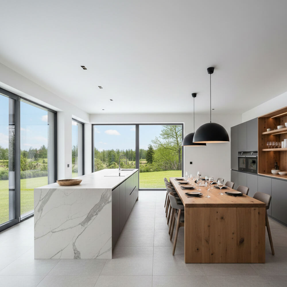 Das kommt auf das Raumgefühl an: Ein Esstisch aus Massivholz bildet einen gemütlichen Kontrast zu einer minimalistischen Kochinsel in Stein- oder Betonoptik. Achte darauf, dass sich Materialien oder Farben (z. B. die Stuhlbeine passend zu den Küchengriffen) wiederholen, um eine harmonische Verbindung zwischen den Zonen zu schaffen.