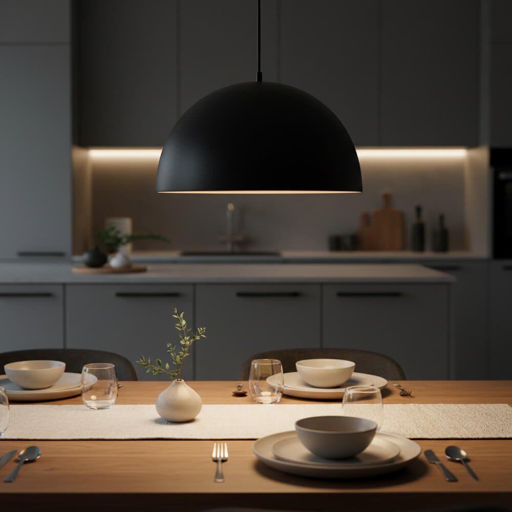 Setzt über dem Esstisch auf markante Pendelleuchten. Sie bilden ein optisches Zentrum und grenzen den Bereich klar vom funktionalen Arbeitslicht der Küche ab.