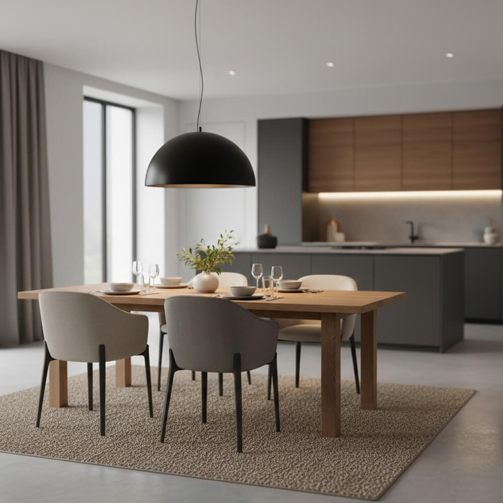 Ein großzügiger Teppich unter dem Esstisch wirkt wie eine Insel. Er dämpft den Schall und definiert klar: „Hier wird genossen.“