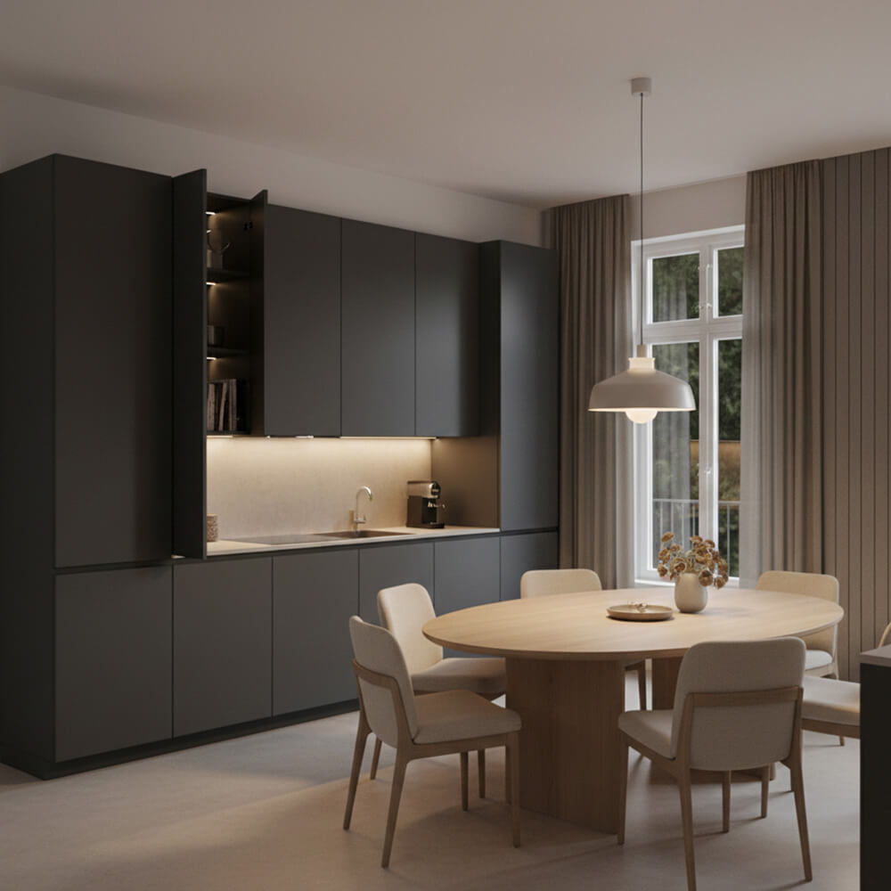 In kleinen Räumen sind multifunktionale Möbel der Schlüssel. Eine verlängerte Arbeitsplatte an der Küchenzeile kann als kompakter Esstisch dienen. Helle Fronten und deckenhohe Schränke lassen den Bereich größer wirken. Klapptische bieten volle Flexibilität, wenn Gäste kommen.