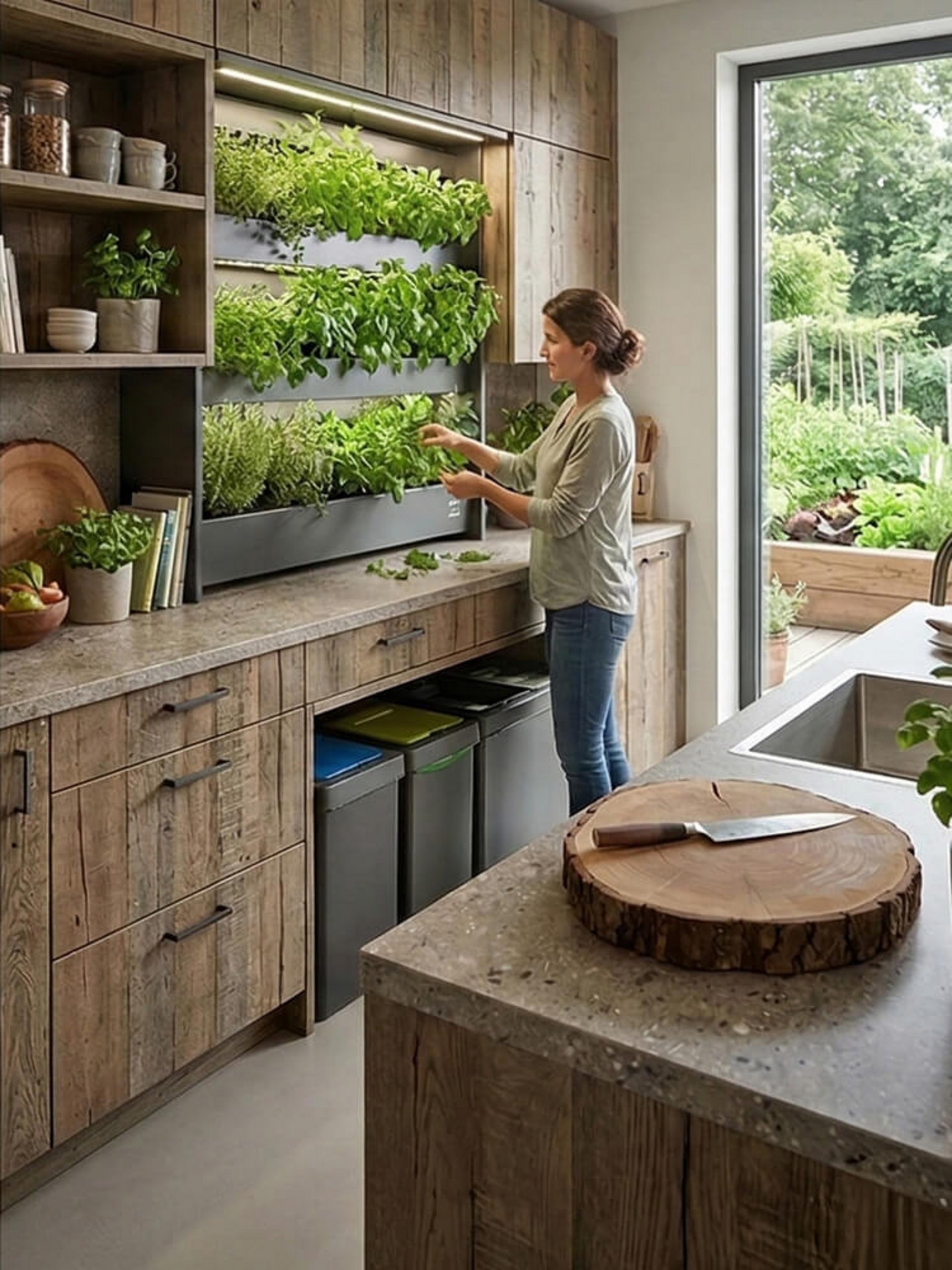 Wenn die Küche zum Garten wird, sprechen wir von Biophilic Design. Wir verwenden natürliche Texturen und echte Materialien. Integrierte Kräuterwände bringen die Natur direkt ins Haus und sorgen für ein gesundes Raumklima.