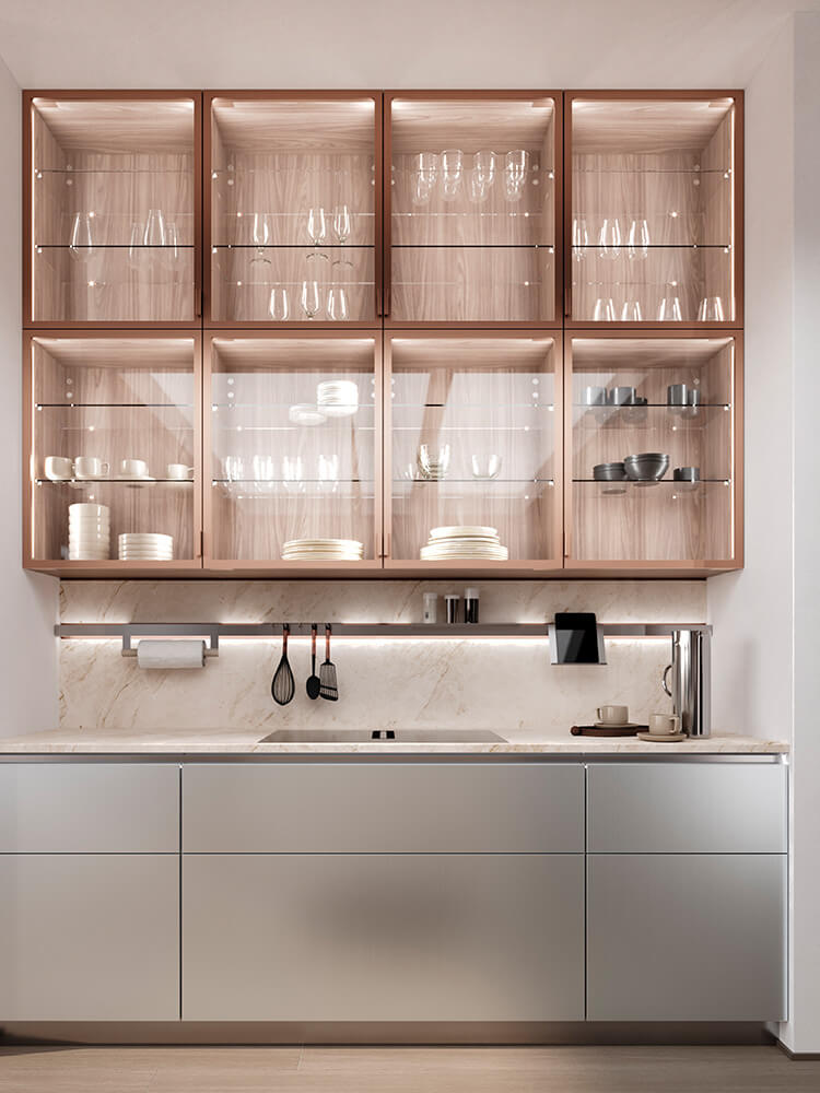 Smart Glass ist extrem glatt und widerstandsfähig gegen Küchendämpfe. Es lässt sich wesentlich leichter reinigen als klassisches Riffelglas oder offene Regale.