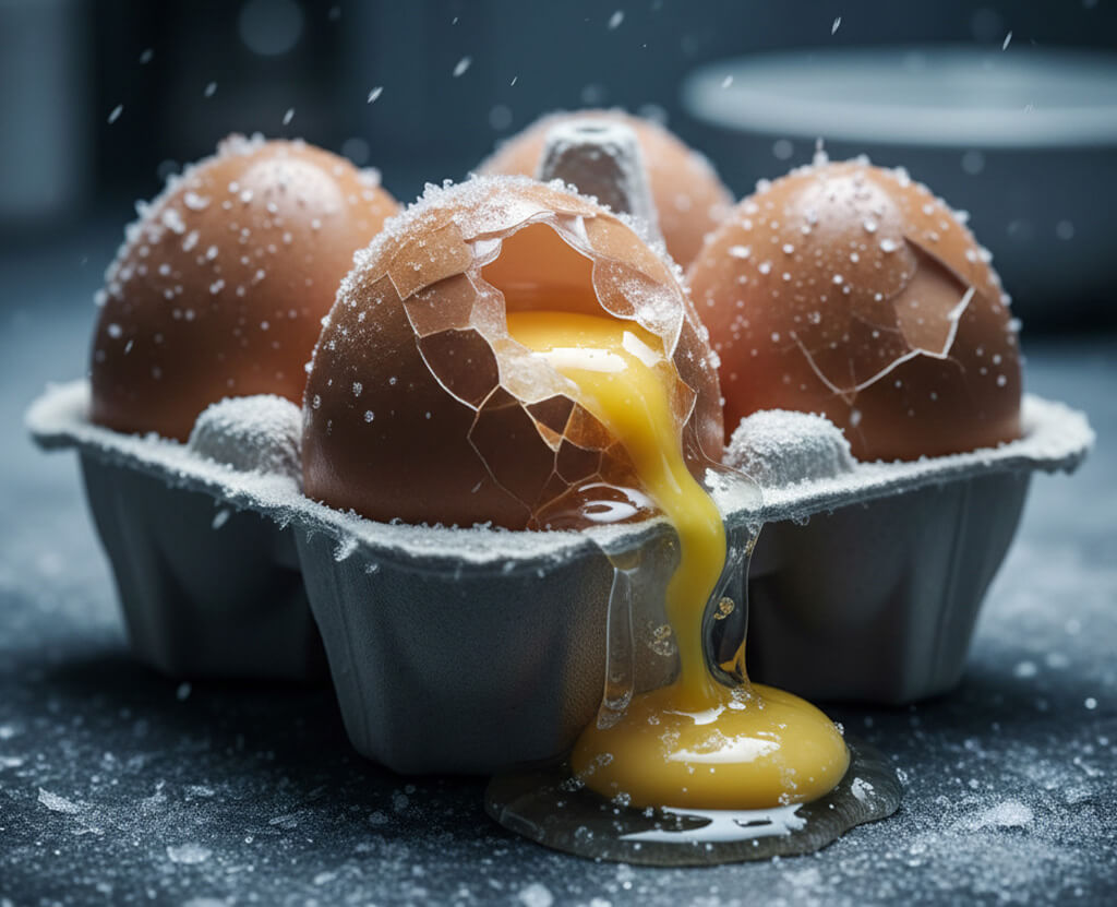 Dieses Bild zeigt deutlich, was passiert, wenn sich das Innere des Eies ausdehnt. Die Schale platzt unkontrolliert – ein Paradies für Bakterien und eine klebrige Angelegenheit im Gefrierfach.