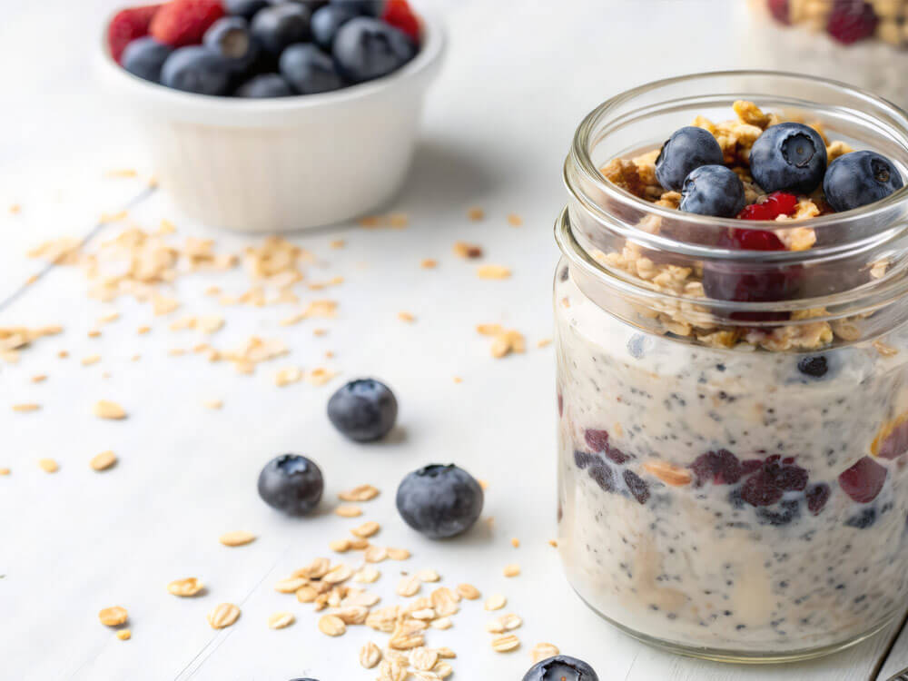 Bereitet Euch am Abend Haferflocken mit Milch oder einer pflanzlichen Alternative zu und mischt Leinsamen, Chiasamen oder Haferkleie unter. Am Morgen noch mit Beeren toppen – fertig ist ein sättigendes Frühstück mit gleich mehreren Ballaststoffquellen.
