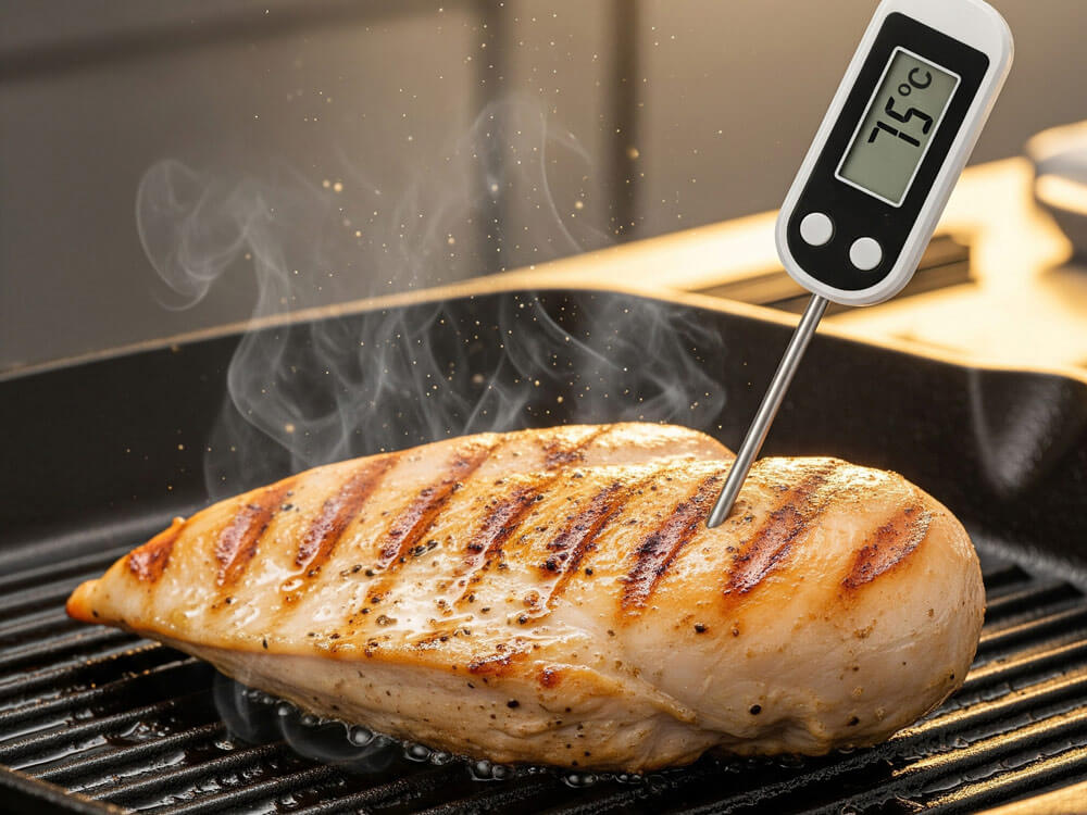 Die wahre Sicherheit liegt in der Hitze. Gart Geflügelfleisch immer vollständig durch, bis es im Inneren eine Kerntemperatur von mindestens 70 °C erreicht. Das Fleisch sollte dann durchgehend weiß sein und klarer, nicht-rosafarbener Saft austreten.
