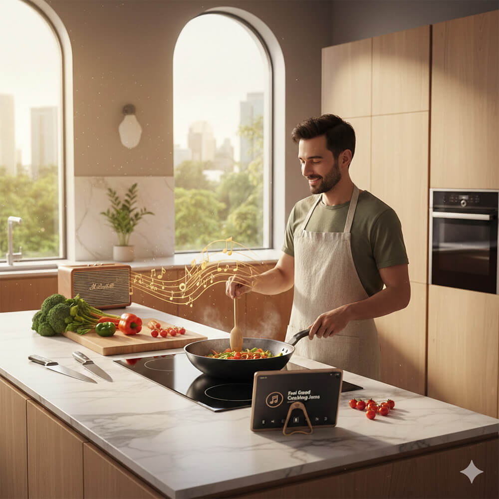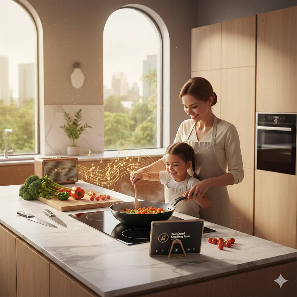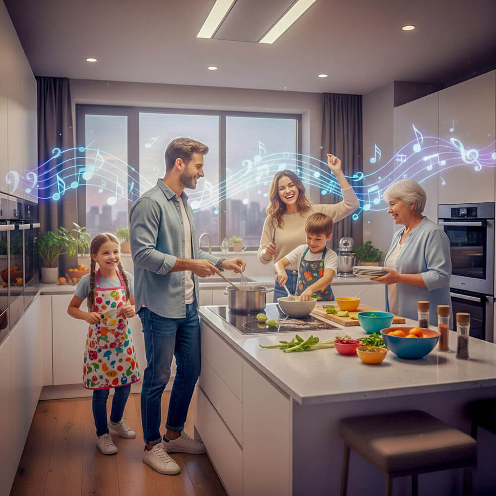 Besonders in einer offenen Wohnküche verbindet Musik Generationen. Wenn Ihr gemeinsam mit Eurem Partner oder Euren Kindern kocht, schafft ein gemeinsamer Soundtrack positive Erinnerungen:
