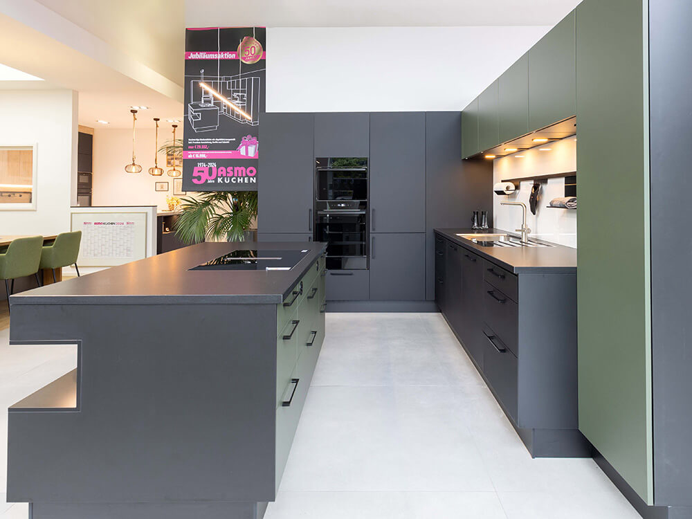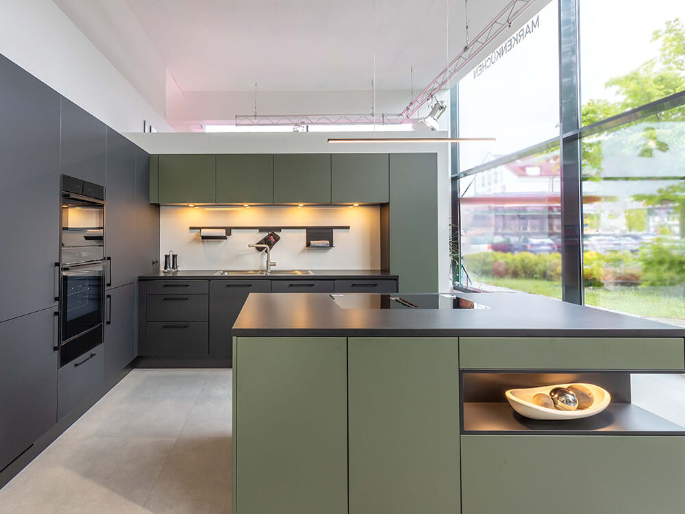Moderne Küchengestaltung – Stilvolles Schwarz und warmes Olivgrün