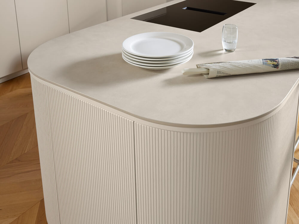 Die sanft abgerundete Abschlusswange der Kochinsel wirkt wie ein Kunstwerk im Raum. Die feine Rillenstruktur der Fronten in Eiche Angora grau erzeugt ein faszinierendes Spiel aus Licht und Schatten. Es entsteht eine haptische Tiefe, die zum Berühren einlädt. Die bündig eingelassene Kochstelle unterstreicht das minimalistische Konzept und lässt die Arbeitsfläche wie aus einem Guss erscheinen.