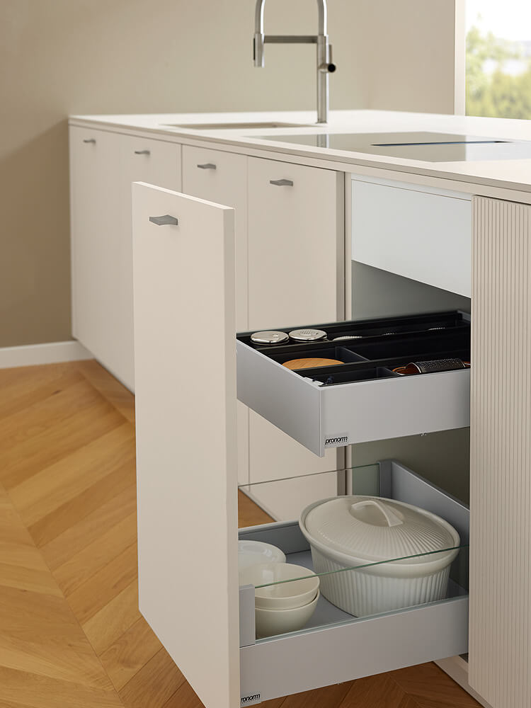 Wahre Schönheit offenbart sich oft erst beim zweiten Blick – nämlich dann, wenn man die Schränke öffnet. So wird ein Organisationssystem sichtbar, das Ordnungsliebhaber begeistern wird. Das hochwertige Innenleben in der eleganten Farbe Titan bietet jedem Gewürzglas und jedem Küchenhelfer seinen festen, sicheren Platz. Nichts verrutscht beim Öffnen oder Schließen, alles bleibt perfekt sortiert und sofort griffbereit. Besonders hervorzuheben sind die transluzenten Seitenzargen des Auszugs: Sie lassen das Licht tief in das Innere dringen und verleihen dem Stauraum eine moderne, fast schwebende Leichtigkeit. Es ist die perfekte Symbiose aus technischer Präzision und ästhetischem Anspruch, die das tägliche Kochen zu einem reibungslosen Erlebnis macht.