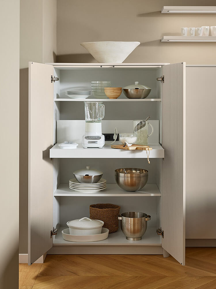 Hinter eleganten Fronten verbirgt sich ein echtes Funktionswunder. Der ausziehbare Tablarboden bringt Küchengeräte direkt in die ergonomisch richtige Arbeitshöhe. Nach der Nutzung verschwinden Mixer und Co. wieder dezent im Schrank. Das hält die Arbeitsflächen frei und bewahrt die cleane Optik des Raumes. Integrierte Steckdosen machen diesen Schrank zur autarken Arbeitsstation.