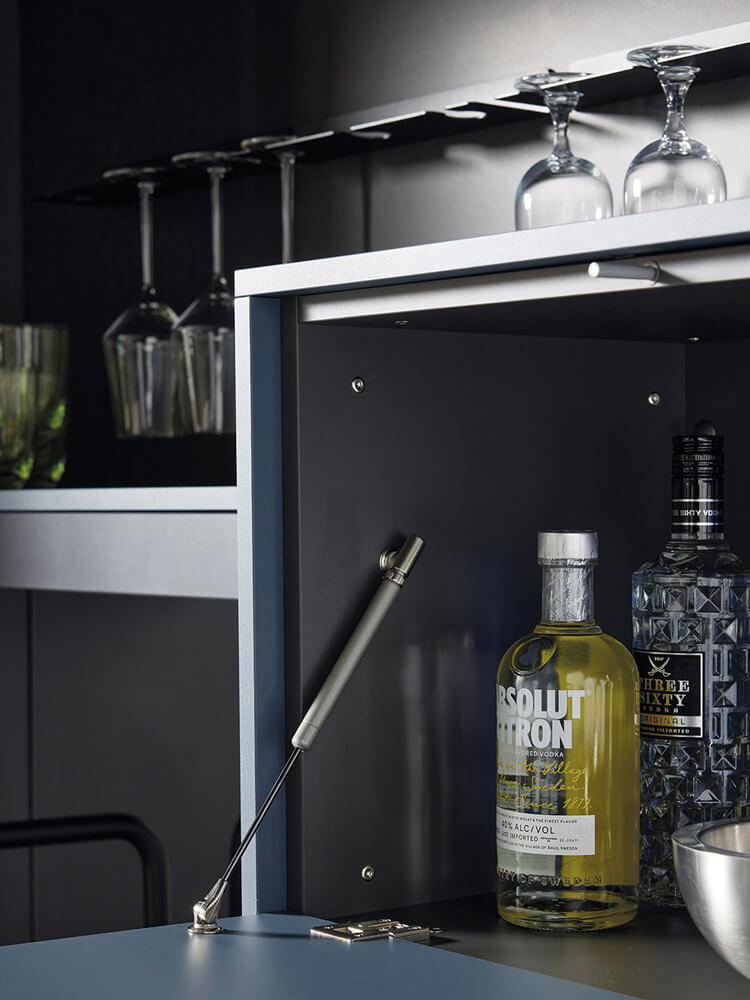 Details machen den Unterschied zwischen einer gewöhnlichen und einer außergewöhnlichen Küche aus. Das geöffnete Barfach der ER Alteiche schwarz offenbart eine Welt des Genusses. Das matte Graphitblau der Klappe bildet einen stilvollen Kontrast zu den glänzenden Oberflächen der Accessoires. Alles ist griffbereit und logisch angeordnet. Integrierte Glashalter sorgen für Ordnung und Sicherheit. Ein solches Element verwandelt Ihre Küche im Handumdrehen in eine private Lounge für Gäste. Eine fachgerechte Küchenplanung hilft Ihnen dabei, solche individuellen Wünsche technisch perfekt umzusetzen.