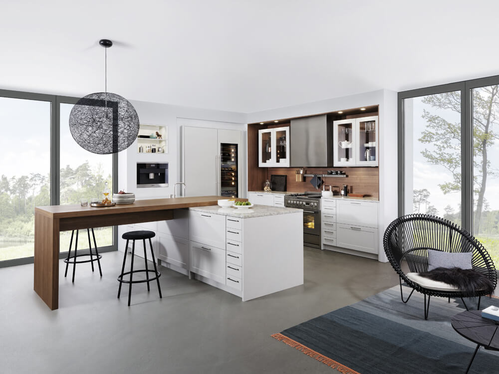 Ein interessantes Spiel mit den Oberflächen zeichnet diese Stilküche aus. Matt lackierte Rahmenfronten in Kombination mit ebenfalls mattlackierten, flächigen Fronten ergänzen sich elegant mit glatten Oberflächen aus amerikanischem Nussbaum. Ein Stilmix, der Charakter hat und gefällt. Erzeugen die matt lackierten Oberflächen ein Moment der Sachlichkeit, bringt der wamrtonige Nussbaum das emotionale Moment.