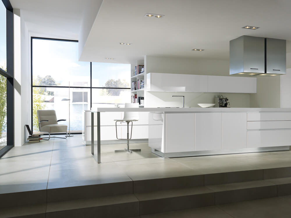 Diese Küche präsentiert sich in einem modernen und minimalistischen Stil mit einer dominanten weißen Farbpalette. Die Schränke sind grifflos und glatt, was dem Raum eine saubere Linienführung verleiht. Große Fenster bieten einen großzügigen Blick auf eine Wasserfläche außerhalb und sorgen für viel natürliches Licht.