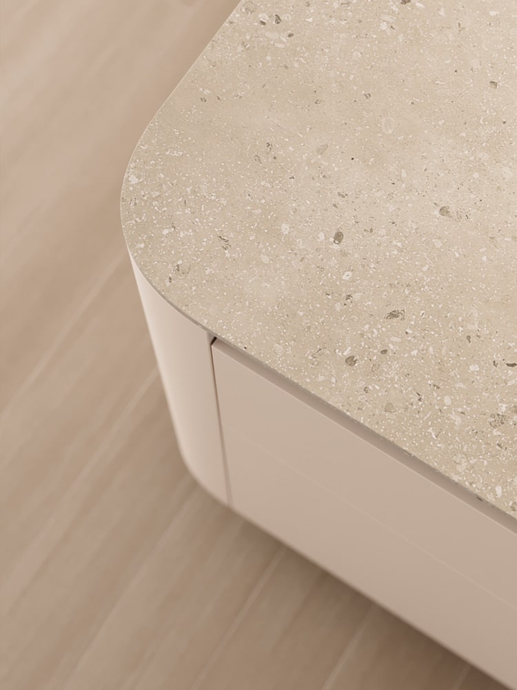 Die kompakte Arbeitsplatte besitzt natürliche Einschlüsse und wirkt wie massiver Stein - gleichzeitig modern und zeitlos. Die Radiusführung der Platte passt exakt zur Kante des Unterschranks. Hier zeigt sich die Fertigungskompetenz von LEICHT: keine Kantenversätze, keine Unterbrechungen, sondern ein präziser Übergang von Fläche zu Form.