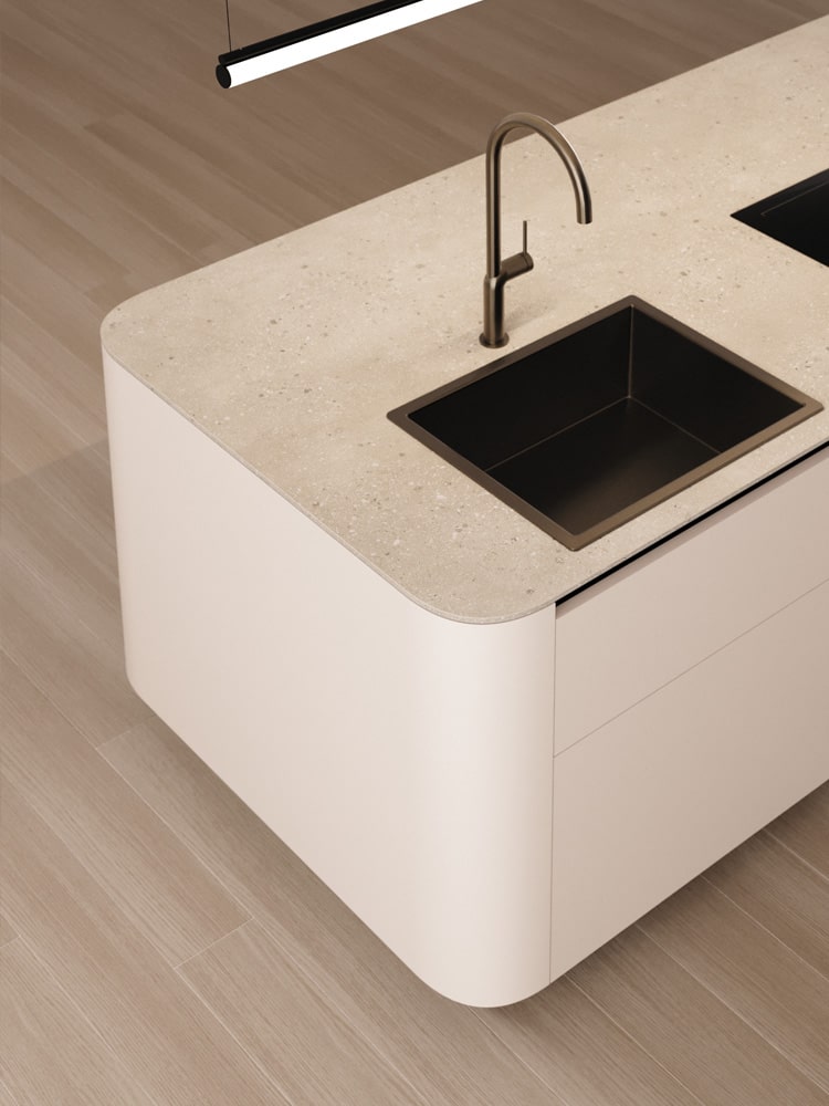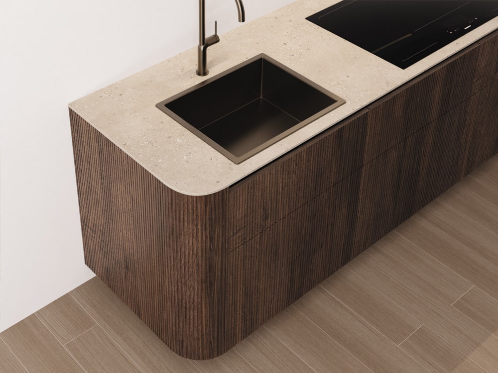 Die sanfte Formgebung rund um die Spüle wirkt einladend, offen und modern. Sie bringt technische Funktionalität und wohnliche Wirkung in Einklang - ideal für offene Küchenkonzepte, in denen Übergänge zwischen Lebensbereichen bewusst gestaltet werden.