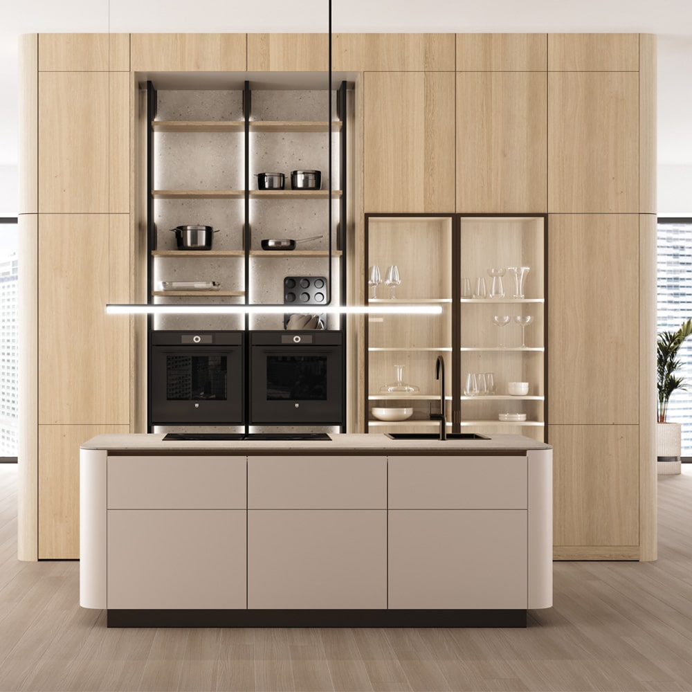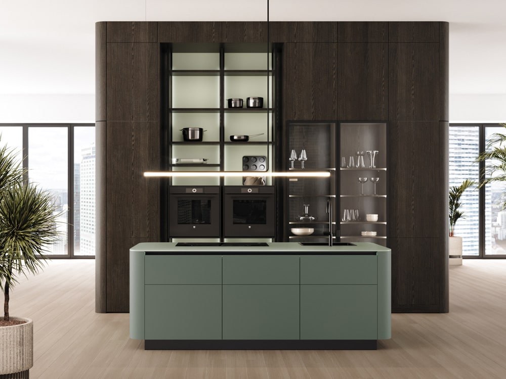 Das Mattlack-Finish absorbiert Licht sanft und verleiht der Oberfläche eine ruhige Tiefe. Die Rundung an der Seitenfläche der Insel sorgt für ein geschlossenes Erscheinungsbild, das besonders in offenen Räumen Wirkung entfaltet. Der zentrale Küchenblock wirkt nicht wie ein Möbelstück, sondern wie ein eigenständiges Element im Raum - eingebettet in die Architektur, aber gleichzeitig selbstbewusst präsent. So entsteht eine Küche, die weit mehr als funktionaler Arbeitsbereich ist: ein Ort mit Atmosphäre.
