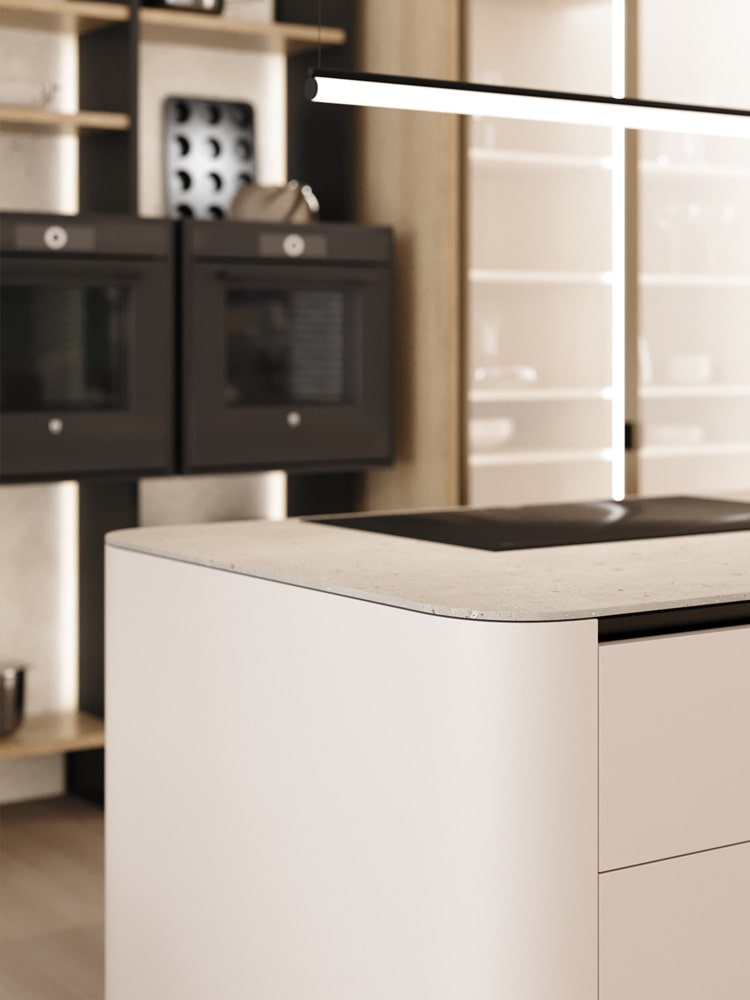 Die Rundungen zeigen sich als gestalterisches Bindeglied zwischen Oberfläche, Funktion und Raum. Sie rahmen nicht nur die Kücheninsel, sondern fügen sich als Gestaltungselement in das Gesamtbild ein - subtil, aber prägend.