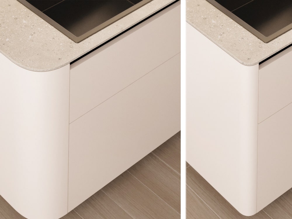 Beide Varianten sind wahlweise ein- oder zweiseitig gerundet. Diese Modularität erlaubt individuelle Anpassungen an jeden Grundriss. Die formschönen Rundungen lassen sich mit passenden Arbeitsplatten, Abdeckböden und Tischplatten kombinieren - für ein durchgängig harmonisches Gesamtbild.