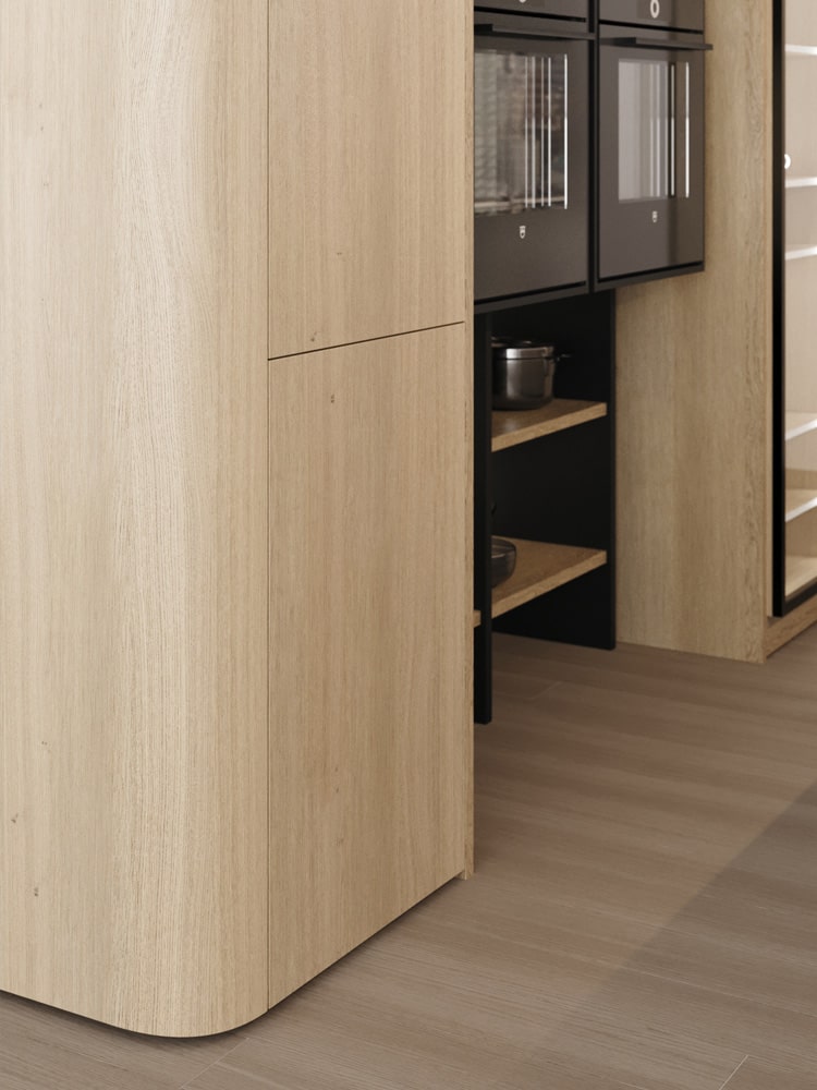 Eine helle Holzumgebung trifft auf ein zentrales Küchenelement, das durch sanfte Rundungen wie selbstverständlich im Raum ruht - ein Ort, der Ruhe ausstrahlt und zum Verweilen einlädt. Die Rundwangen fassen die Insel an beiden Seiten elegant ein. Der fließende Übergang vom Korpus zur Arbeitsplatte mit passender Eckrundung. Diese Gestaltung verleiht dem Möbel eine beruhigende Kontur, ohne den Anspruch an Präzision zu verlieren.
