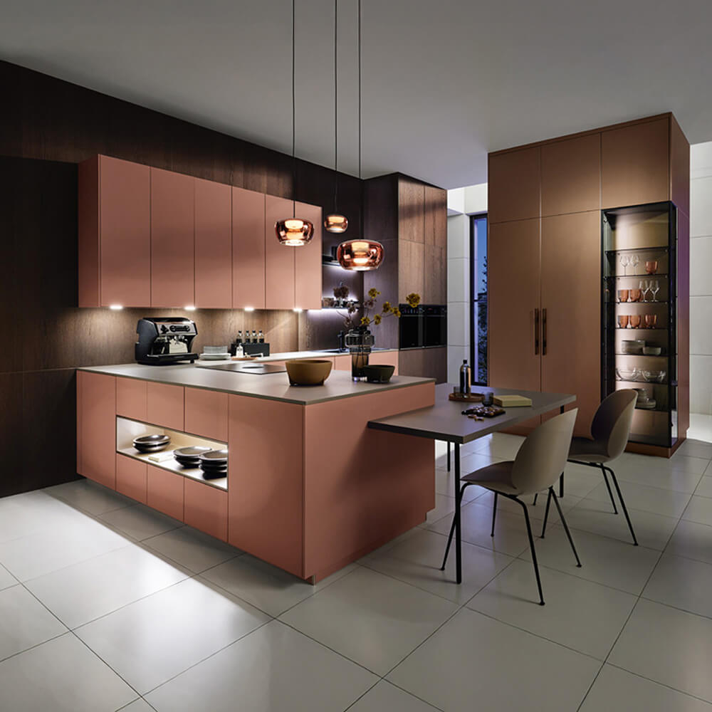 Es gibt Werte, die niemals aus der Mode kommen, weil sie uns an das erinnern, was wirklich zählt: Handwerk, Beständigkeit und Wärme. In dieser Welt trifft die Liebe zum Detail auf eine moderne Formsprache. Wir kombinieren das tiefe Wissen um Materialien wie Eiche oder Lederoptik mit frischen Farbakzenten wie Altrose. Es ist ein Raum, der Geschichten erzählt – von Familienrezepten, die seit Generationen weitergegeben werden, und von einem Design, das heute schon ein Klassiker von morgen ist. Hier fühlt man sich nicht nur wohl, hier fühlt man sich verwurzelt. Lassen Sie sich von diesen Modellen begeistern: VC-buffalo mocha, LM-Mattlack altrose espressobraun und die LEICHT-Wakuu.