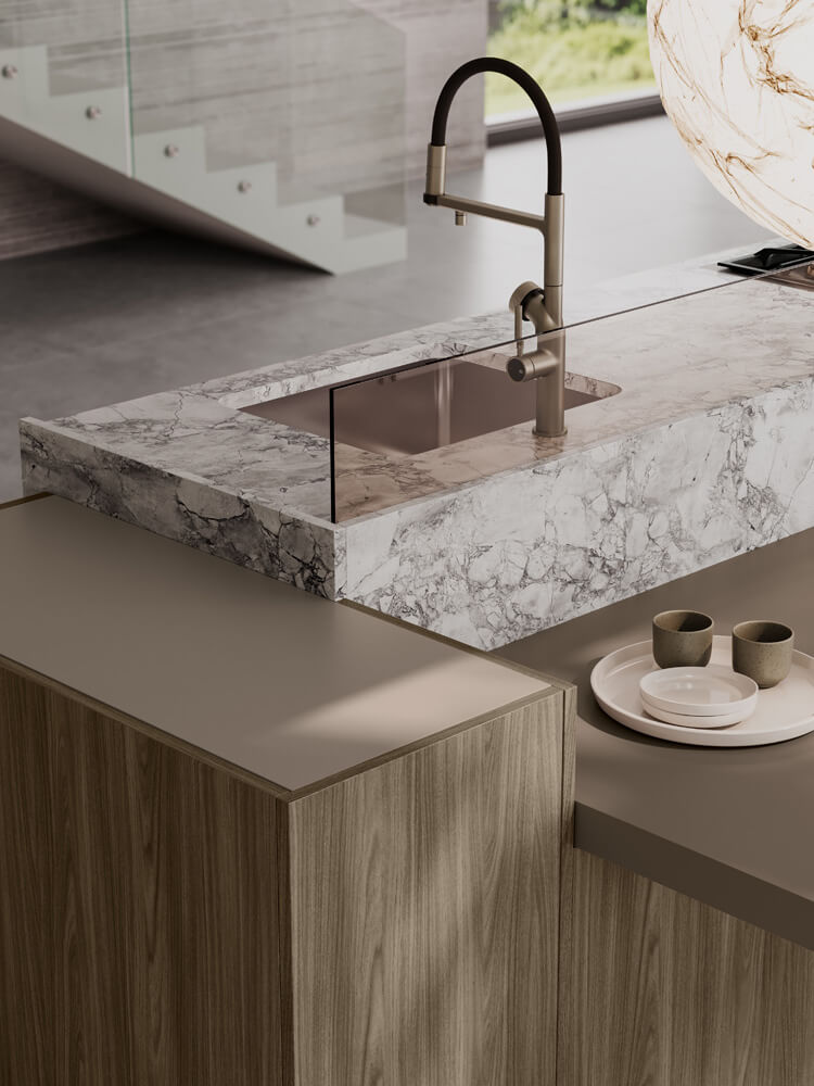 Die Verbindung von Stein, Holz und den neuen IDEA-Oberflächen ist hier besonders greifbar. Die Armaturen in Metallic-Optik passen hervorragend zu den matten Tönen. Jedes Element ist sorgfältig aufeinander abgestimmt. Diese Materialvielfalt sorgt für eine lebendige und dennoch ruhige Optik. Es ist modernes Design für höchste Ansprüche.