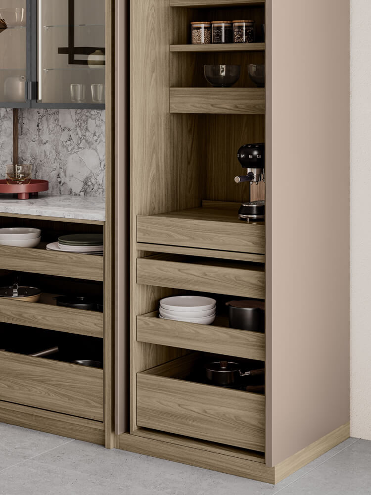 Wahre Schönheit kommt von innen. Die geöffneten Auszüge zeigen ein durchdachtes Ordnungssystem aus edlem Holz. Jedes Utensil findet seinen festen Platz. Die Technik arbeitet lautlos und geschmeidig. So wird der Alltag in der Küche zum reinen Vergnügen. Die Kombination aus äußeren opaken Flächen und innerer Holzoptik schafft einen spannenden Materialmix.