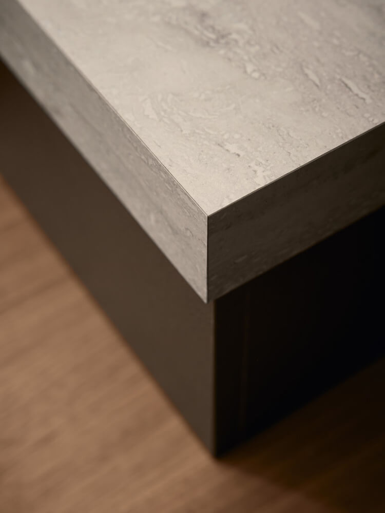 Im Detail verdeutlicht die hohe Verarbeitungsqualität jeder einzelnen Komponente. Filigrane Linienführung trifft auf technische Präzision an den Materialübergängen. Die Arbeitsplatte fügt sich nahtlos in das puristische Designkonzept ein. Diese Liebe zum Detail macht die Gestaltung nicht nur sichtbar, sondern auch spürbar. Es ist ein Statement für anspruchsvolles Wohnen ohne Kompromisse.