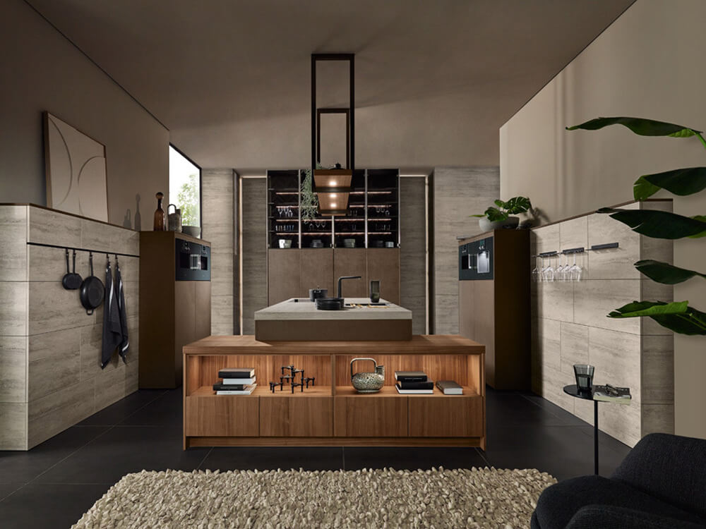 Das Gesamtbild zeigt eine Architektur, die Klarheit und Wärme perfekt vereint. Die warme Farbgebung des Nussbaumholzes trifft auf die dunklen Akzente von VC buffalo mocha. Es entsteht ein Ort der Ruhe und Struktur für den urbanen Alltag. Die zentrale Insel dient als kommunikatives Herzstück des Wohnraums. Sanfte Lichtakzente unterstreichen die hochwertige Materialwahl und schaffen eine behagliche Atmosphäre