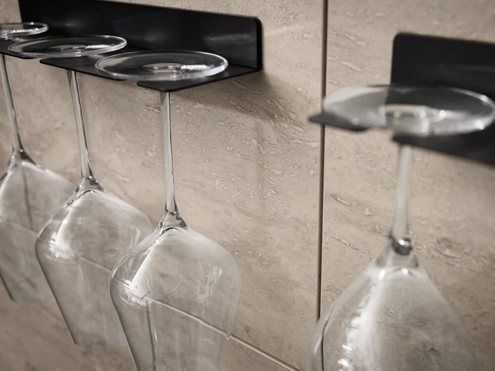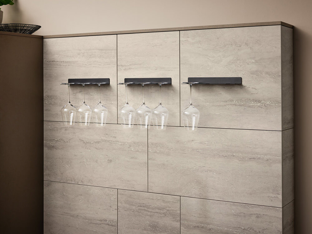 An der stilvollen Wand in Travertin-Optik wird die Weinglashalterung zu einem besonderen Blickfang. Die minimalistische Halterung aus schwarzem Metall setzt edle Gläser wirkungsvoll in Szene. Diese Lösung verbindet Stauraum mit hocheffektivem Design. Die raue Struktur des Steins bildet einen spannenden Kontrast zur Feinheit des Glases. Es entsteht eine Atmosphäre von gehobener Gastlichkeit im eigenen Zuhause.