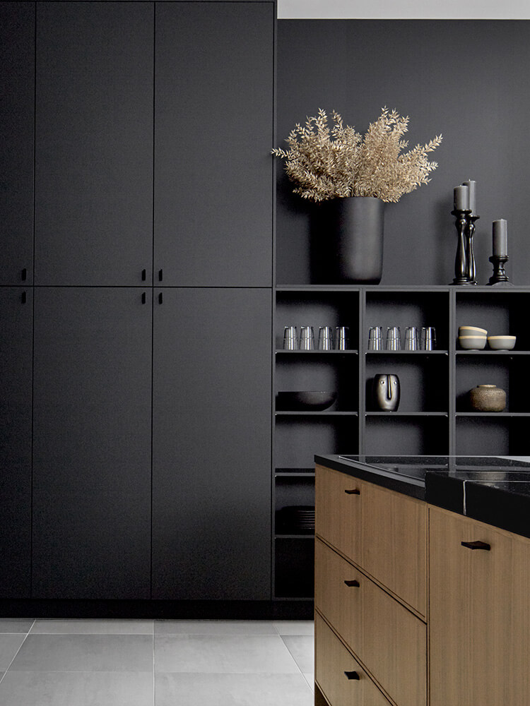 Das monochrome Ambiente in Schwarz verleiht dem Raum eine einzigartige Tiefe. Die ASMO Nussbaum Mondial Küche nutzt diese Farbpalette, um ein Gefühl von Eleganz und Modernität zu vermitteln. Die dunkle Farbgebung dient nicht nur als Hintergrund, sondern hebt auch die natürliche Wärme des Nussbaumholzes hervor. Dieses Kontrastspiel schafft eine faszinierende Atmosphäre, die den Raum zu einem Ort der Ruhe und Stilvolle verwandelt.