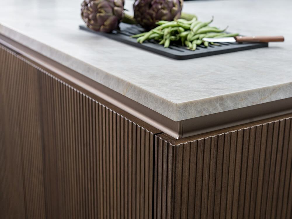 Das Herzstück dieser visionären Küche ist der grifflose Inselblock, der mit seinem integrierten Sitzbereich zu geselligen Stunden einlädt. Umgeben von dem exquisiten Echtholz Oberflächenprogramm BOSSA in edlem Walnuss, strahlt der Inselblock eine einzigartige Wärme aus, die sofort ins Auge fällt. Die präzise gestalteten, vorstehenden, linearen Stäbchen der Front kreieren ein harmonisches Gesamtbild, das nicht nur das Auge erfreut, sondern auch eine lebendige Atmosphäre schafft.