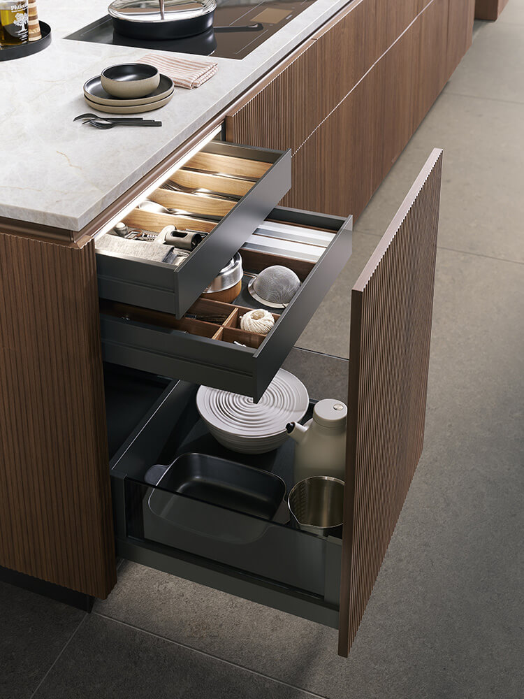 Die Kombination aus dem warmen Walnussholz und der kühlenden Eleganz der Naturstein-Arbeitsplatte schafft ein ausgewogenes und beruhigendes Ambiente. Dieses Gleichgewicht zwischen Wärme und Kühle. Es ist die Essenz zeitgenössischen Designs und spiegelt sich in jedem Detail der LEICHT BOSSA CONCRETE Küche wider.