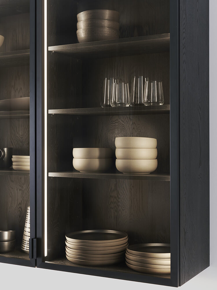 Zwei frei im Raum positionierte Wandelemente bringen Struktur und Ordnung in den Raum. Der blockartig gestaltete, eingelassene Hochschrank im Programm Concrete brasilia und das elegante Sideboard in Carbongrau bieten nicht nur reichlich Stauraum, sondern sind auch Ausdruck höchster Designansprüche. Die über dem Möbel verlaufende Natursteinleiste in ROCCA schafft eine Verbindung zum Inselblock und unterstreicht das durchdachte Zusammenspiel von Material und Form.