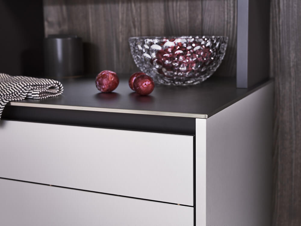 Die Front der LEICHT CONTINO-12 ist das Herzstück dieser Küchenkonzeption. Mit einer Materialstärke von nur 12 mm verleiht sie der grifflosen Küche eine geradlinige und filigrane Ästhetik. Die Auswahl an Farben und Materialien ist beeindruckend: von den 15 exklusiven Mattlack-Farben Les Couleurs® Le Corbusier bis zu den zahlreichen RAL- und NCS-Farben. Jede Oberfläche reflektiert Qualität und Stil, wodurch Ihre Küche zu einem wahren Kunstwerk wird.