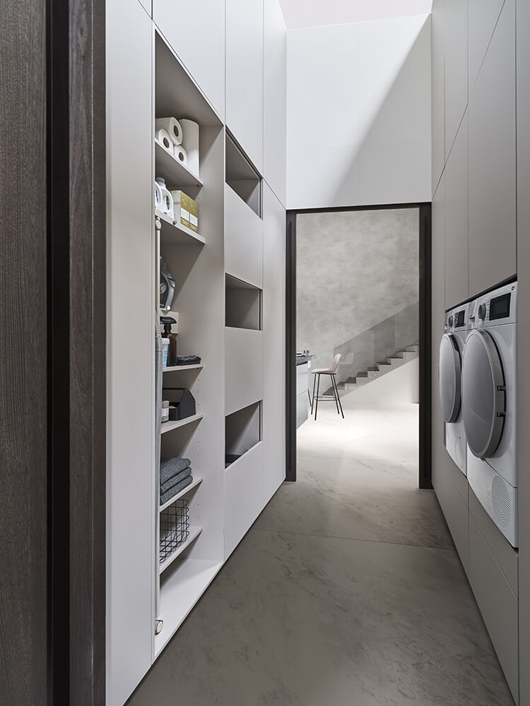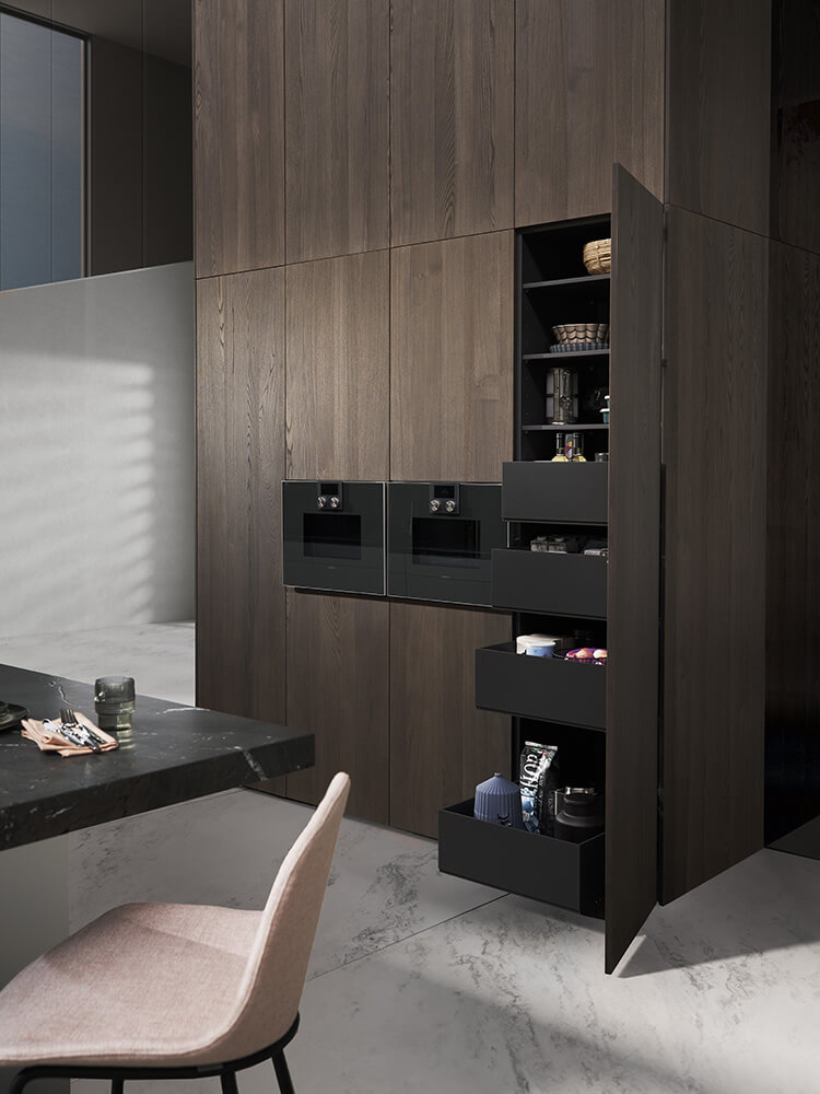 Ein einzigartiges Merkmal ist der freistehende Raum-im-Raum-Kubus. Von außen betrachtet erscheint er als elegante Schrankfront, doch im Inneren verbirgt sich ein begehbarer Hauswirtschaftsraum. Diese Innovation ist mehr als nur ein Stauraum; es ist ein Zeichen von Raffinesse und durchdachtem Design, das die Küche in eine multifunktionale Umgebung verwandelt.