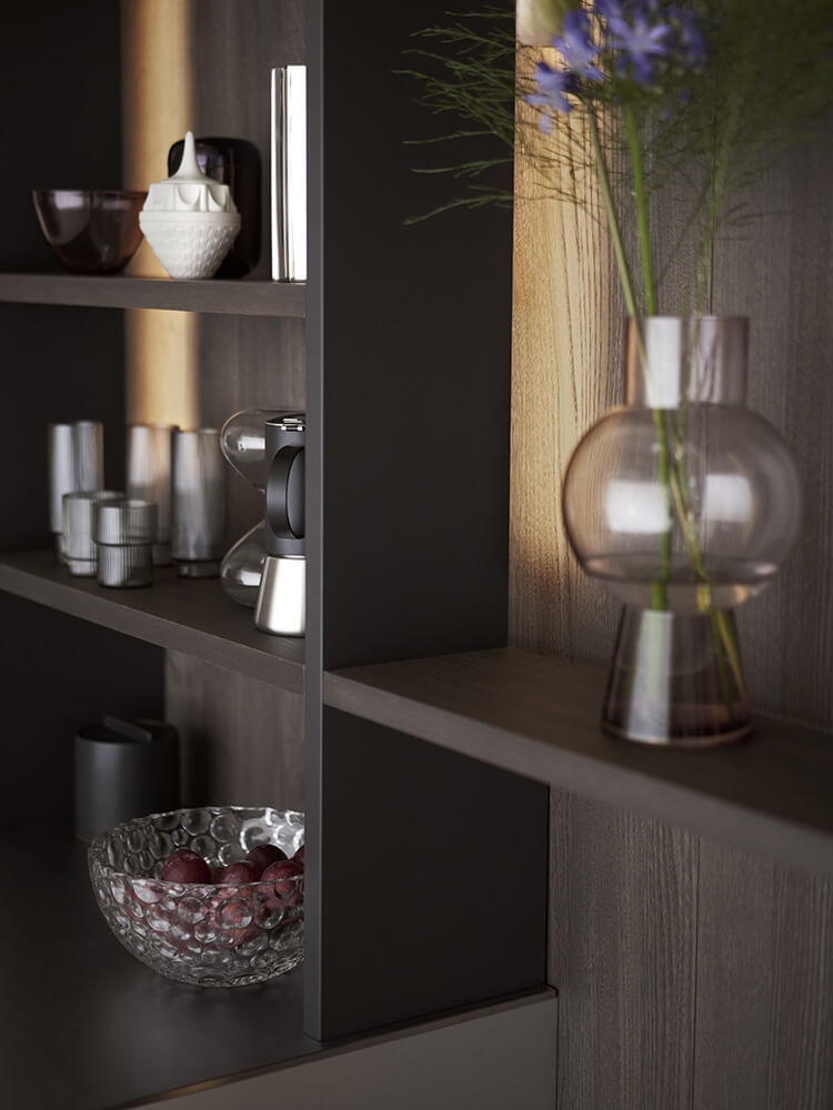 Ein weiteres Highlight ist die Beleuchtung. Hinter den vertikalen Seiten des ICONIC Regals verbirgt sich ein LED-Lichtband, das nicht nur für eine stilvolle Hintergrundbeleuchtung sorgt, sondern auch die dreidimensionale Wirkung der Küche verstärkt. Dieses indirekte Licht schafft eine Atmosphäre, die zum Verweilen einlädt und die Küche LEICHT CONTINO-12 zu einem Ort des Wohlbefindens macht.