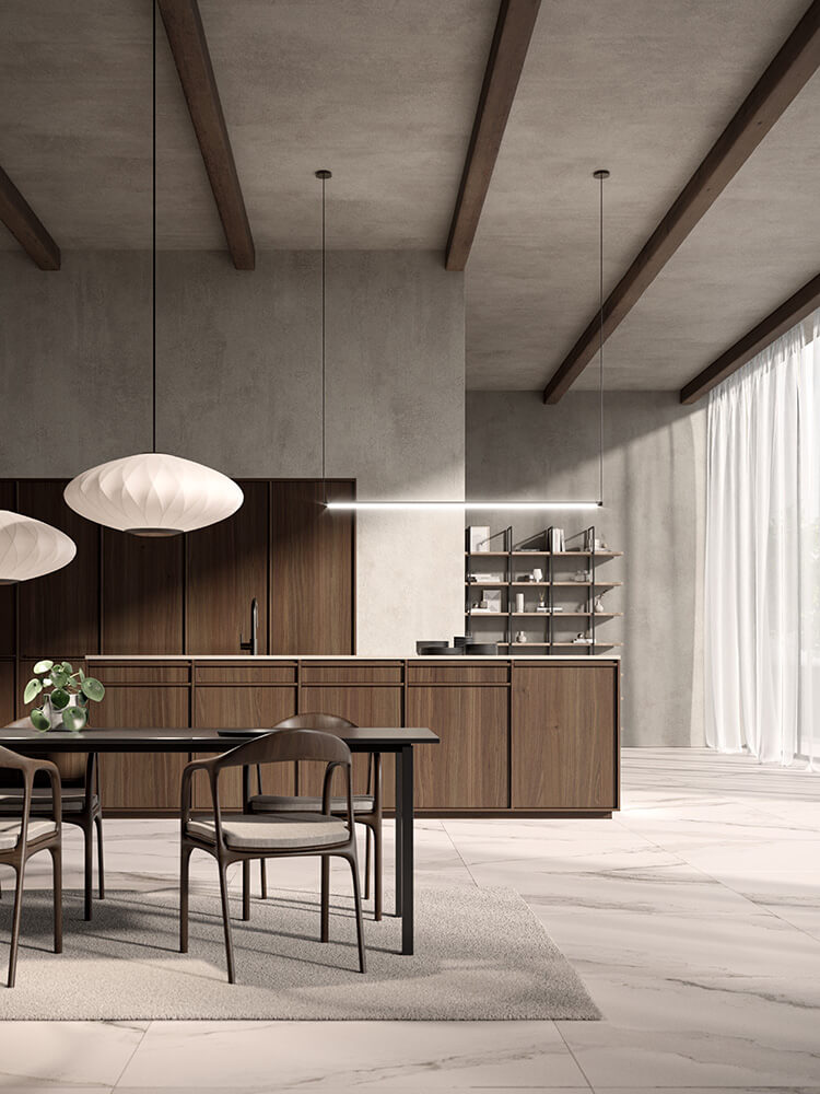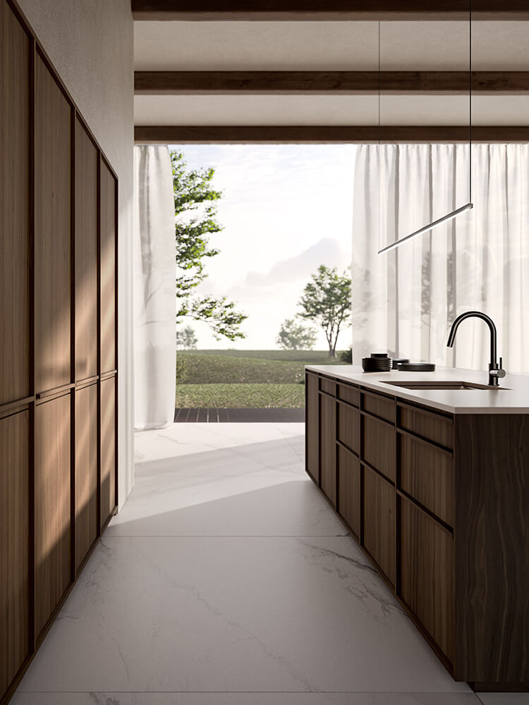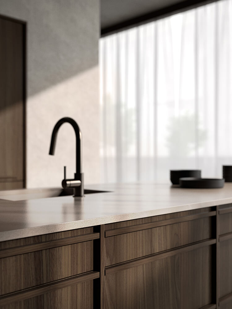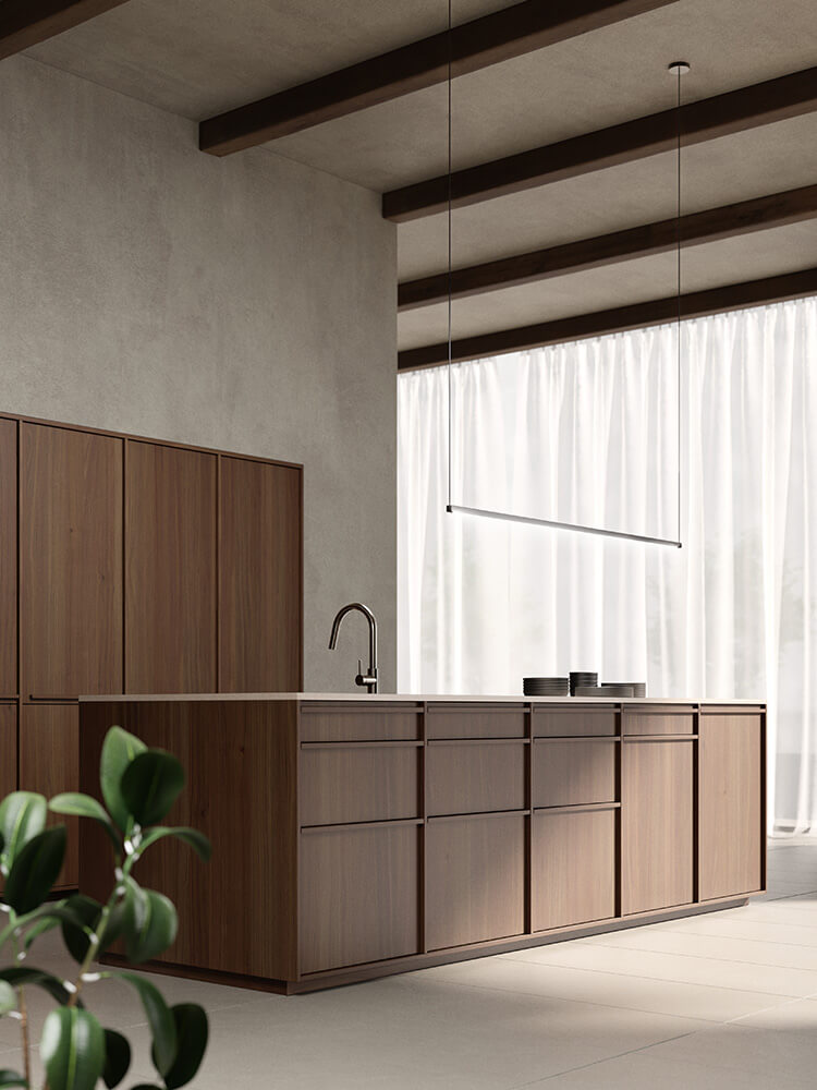 Die Echtholz-Furnierfront von LEICHT KYOTO Küche ist der Inbegriff von Eleganz und Entspannung. Doch was macht sie so einzigartig und unvergesslich? Ihre räumliche Gitterstruktur ist das Gestaltungsmerkmal, das sie von anderen Küchen abhebt. Dieses kunstvolle Muster entsteht durch eine ausgeklügelte Planung von Wangen, Böden und horizontalen Griffen, die eine feingliedrige und filigrane Ästhetik hervorruft. Das Ergebnis ist elegantes Mobiliar, das schlicht gehalten ist und dennoch mit einer klaren Struktur den umgebenden Raum prägt.