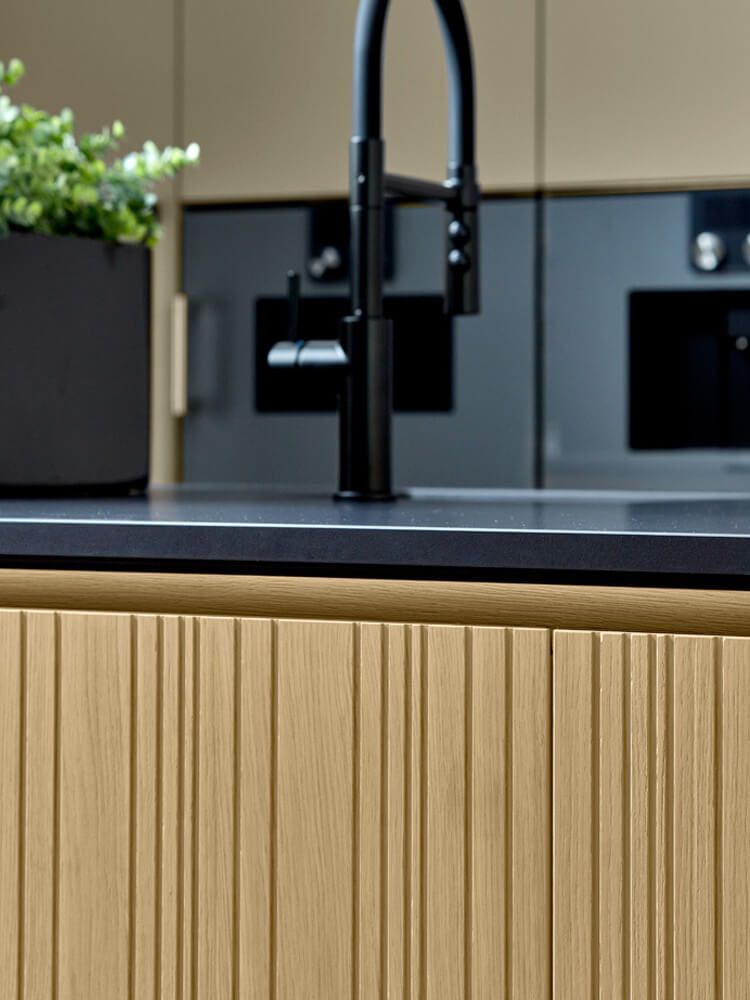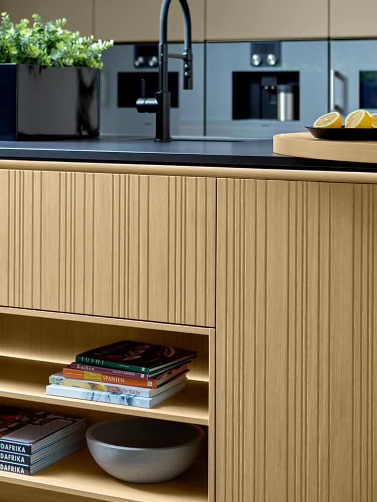 Die asymmetrischen Rillenfronten in Eichenholz verleihen der Küche einen einzigartigen Charakter. Die Kombination mit Naturstein sorgt für eine stilvolle Atmosphäre.